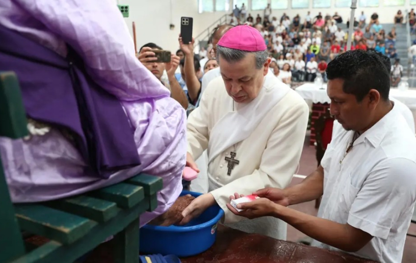 Mérida, Yucatán.- El arzobispo de Yucatán, Gustavo Rodríguez Vega, presidió la ceremonia del lavatorio de pies del del Jueves Santo en el Centro de Reinserción Social de Mérida. Doce personas privadas de la libertad representaron a los apóstoles de Jesús durante el acto. Este evento formó parte de las actividades de la Semana Mayor y rememoró la última cena de Jesucristo con sus discípulos.
