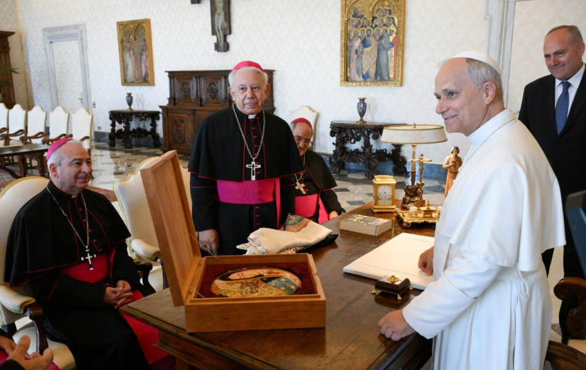 El obispo de Cuernavaca y presidente de la CEM, Ramón Castro Castro, encabezó la delegación episcopal conformada también por el arzobispo de León, Jaime Calderón Calderón; el obispo de Ciudad Obregón, Felipe Pozos Lorenzini; el obispo de Ciudad Valles, Roberto Yenny García; y el propio obispo auxiliar de México, Héctor Mario Pérez. Los pastores mexicanos hicieron entrega de varios obsequios al Papa Prevost entre los que destacaron un platón de porcelana con incrustaciones de plata, un gabán y una artesanía en cerámica, todas con la imagen de Nuestra Señora de Guadalupe.