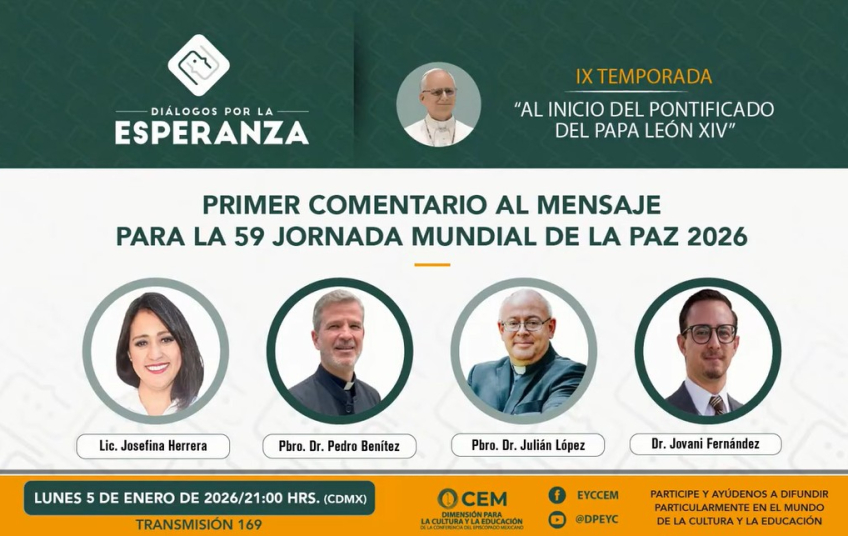 Ciudad de México.- En medio de un contexto global atravesado estrepitosamente por conflictos internacionales de gran calado y por el clamor generalizado de horizontes de reconciliación, el programa Diálogos por la Esperanza, de la Dimensión Episcopal para la Cultura y la Educación de la Conferencia del Episcopado Mexicano, estrenó su novena temporada con un análisis exhaustivo del Mensaje para la 59ª Jornada Mundial de la Paz del papa León XIV, titulado “La paz esté con todos ustedes: hacia una paz desarmada y desarmante”.