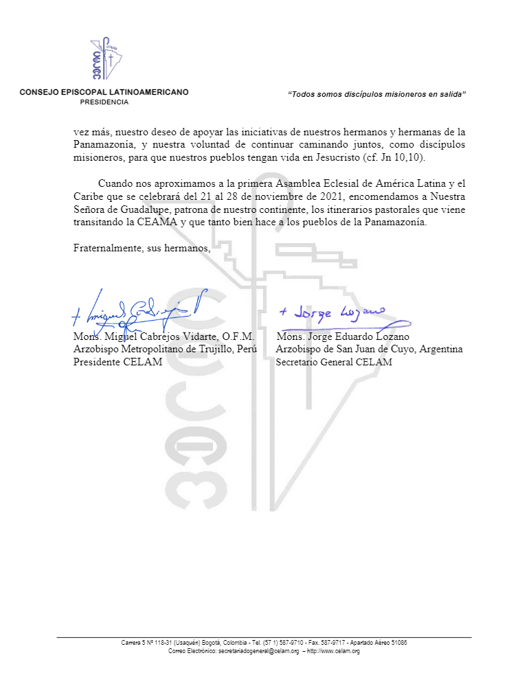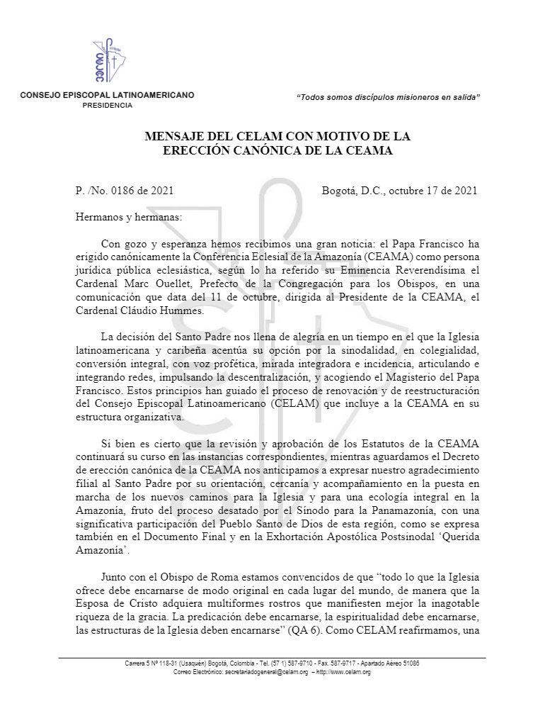 Comunicados 211017-Consejo Episcopal Latinoamericano-Con motivo de la Erección Canónica de la CEAMA Felipe Monroy 17 Octubre 2021 Share On Facebook Share On Twitter Category Comunicados Hits 1349 times Anterior Siguiente tweet