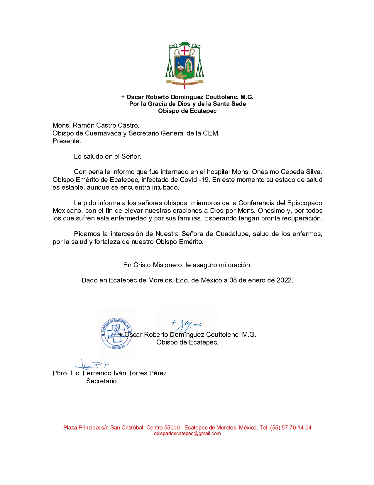 220108-Oscar Roberto Domínguez Couttolenc Obispo de Ecatepec-Carta a la SGCEM sobre el estado de salud del obispo Onésimo Cepeda