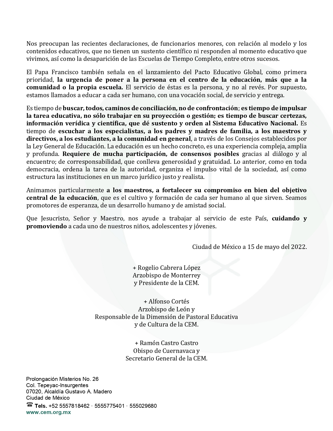 Comunicados 220513-Conferencia del Episcopado Mexicano-Mensaje con motivo del Día del Maestro Felipe Monroy 13 Mayo 2022 Share On Facebook Share On Twitter Category Comunicados Hits 1503 times Anterior Siguiente tweet