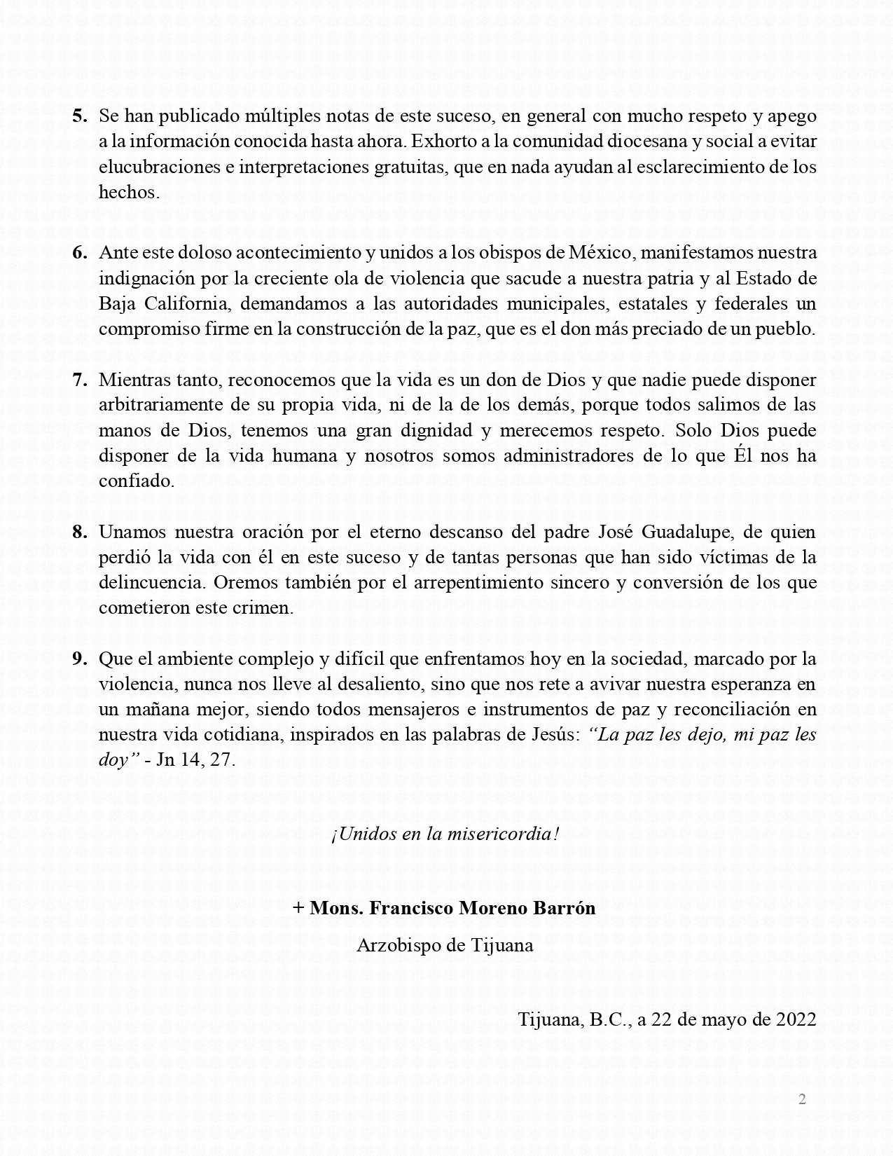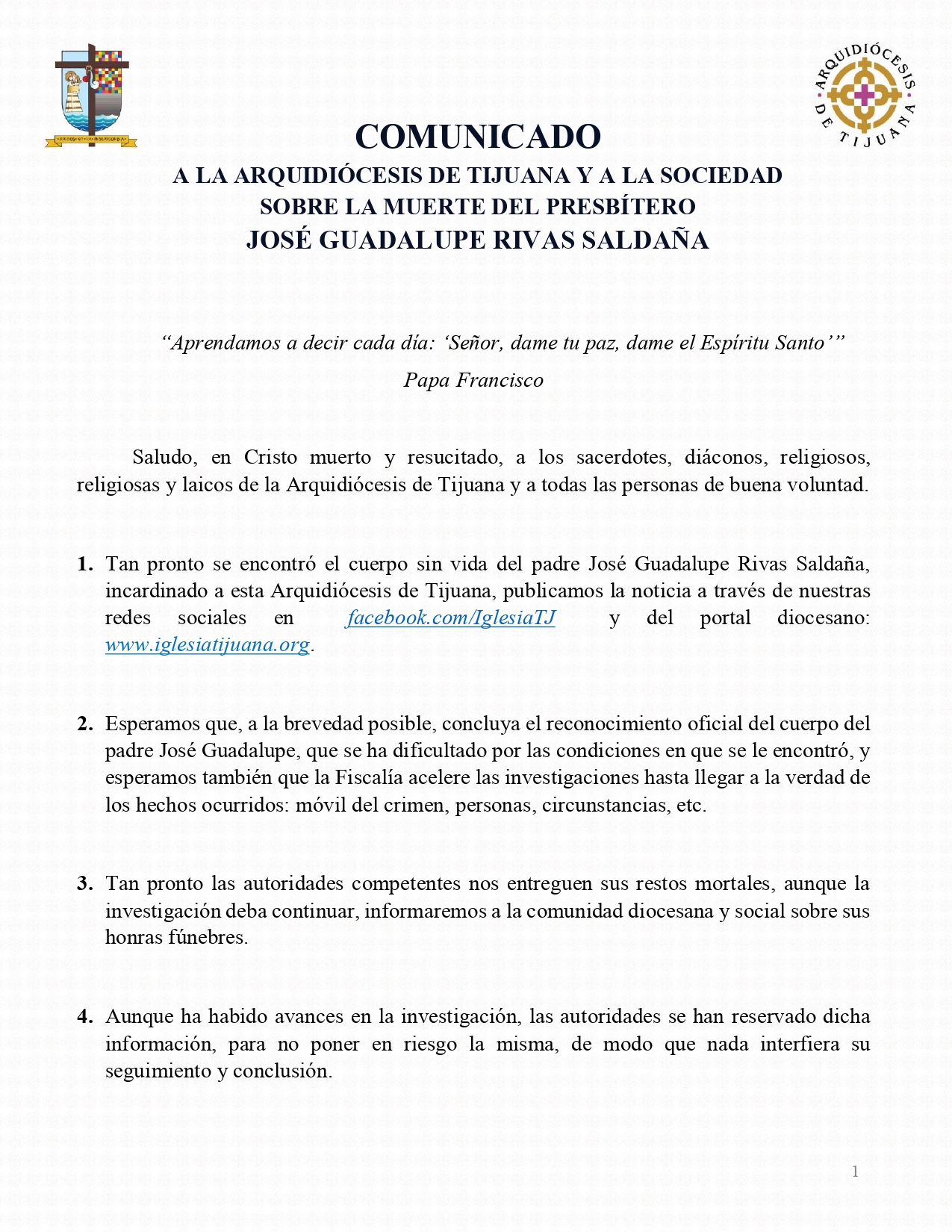 Comunicados 220522-Arquidiócesis de Tijuana-Sobre la muerte del presbítero José Guadalupe Rivas Saldaña Felipe Monroy 22 Mayo 2022 Share On Facebook Share On Twitter Category Comunicados Hits 2958 times Anterior Siguiente tweet