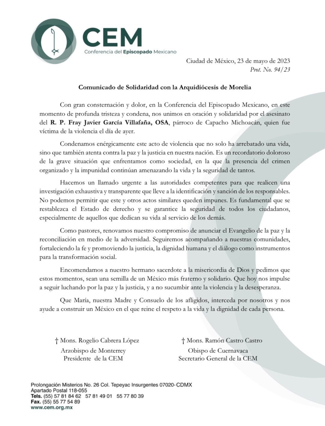Comunicados 230523-Conferencia del Episcopado Mexicano-Solidaridad con la Arquidiócesis de Morelia Felipe Monroy 23 Mayo 2023 Share On Facebook Share On Twitter Category Comunicados Hits 972 times Anterior Siguiente tweet