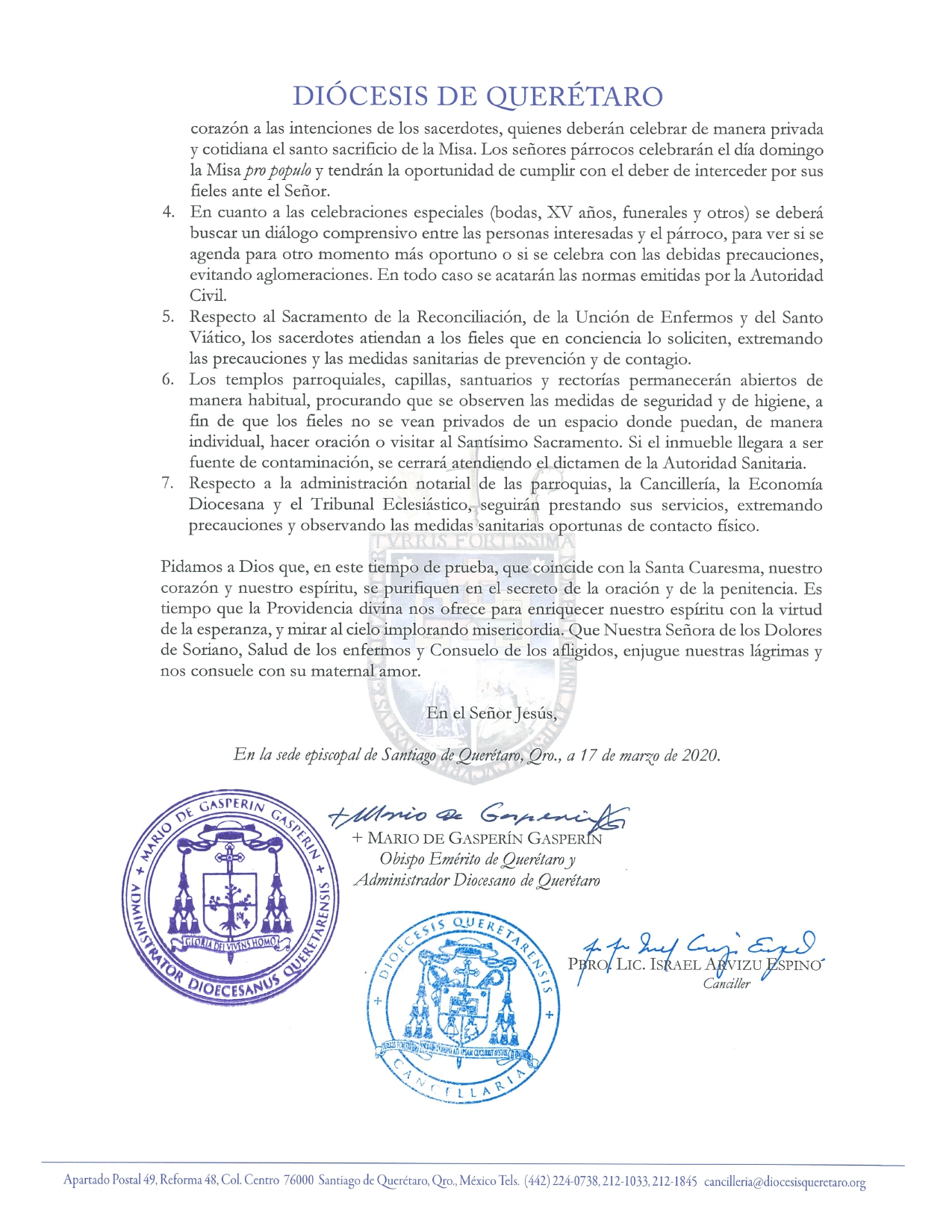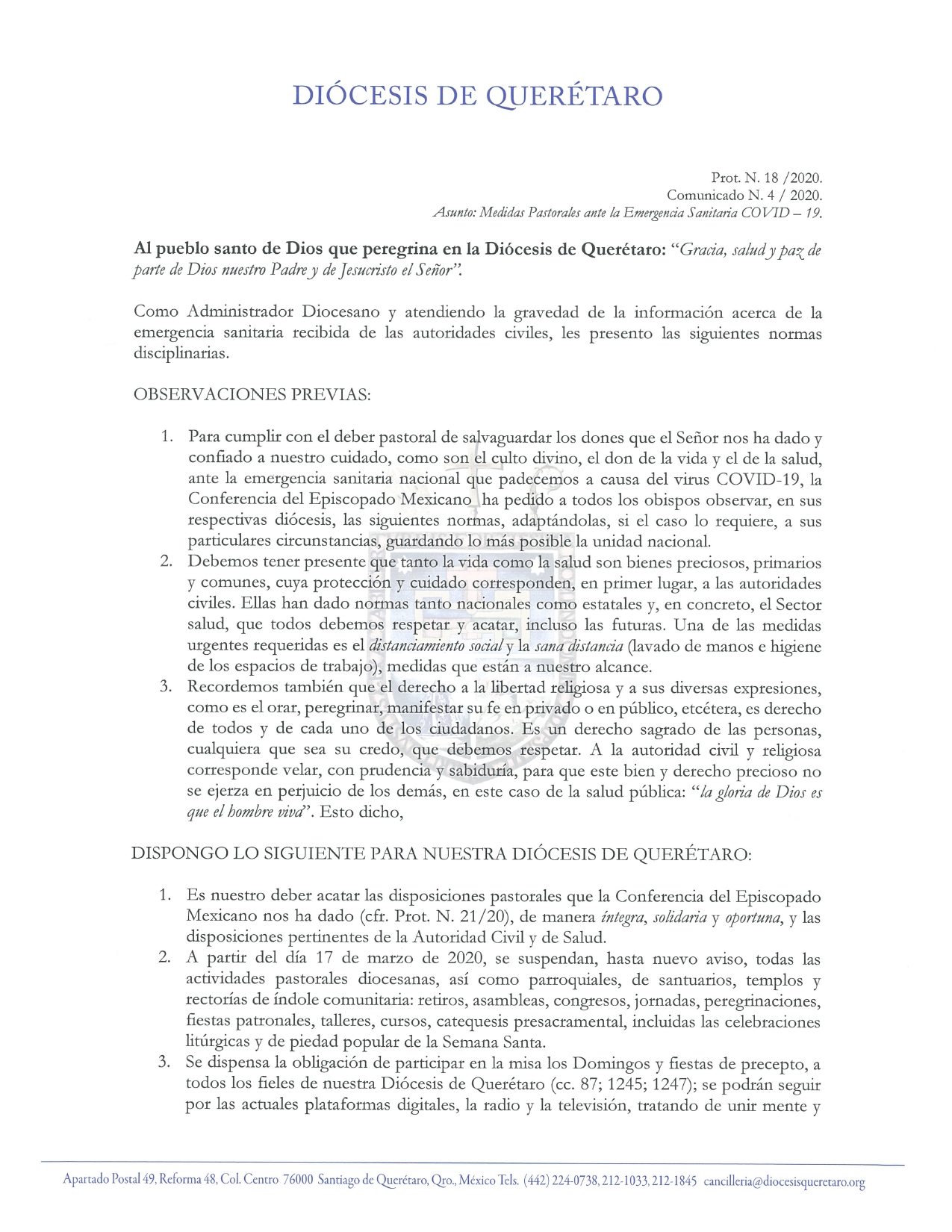 Comunicados 200318-Diócesis de Querétaro-Medidas pastorales ante la emergencia sanitaria COVID-19 Felipe Monroy 18 Marzo 2020 Share On Facebook Share On Twitter Category Comunicados Hits 1561 times Anterior Siguiente tweet