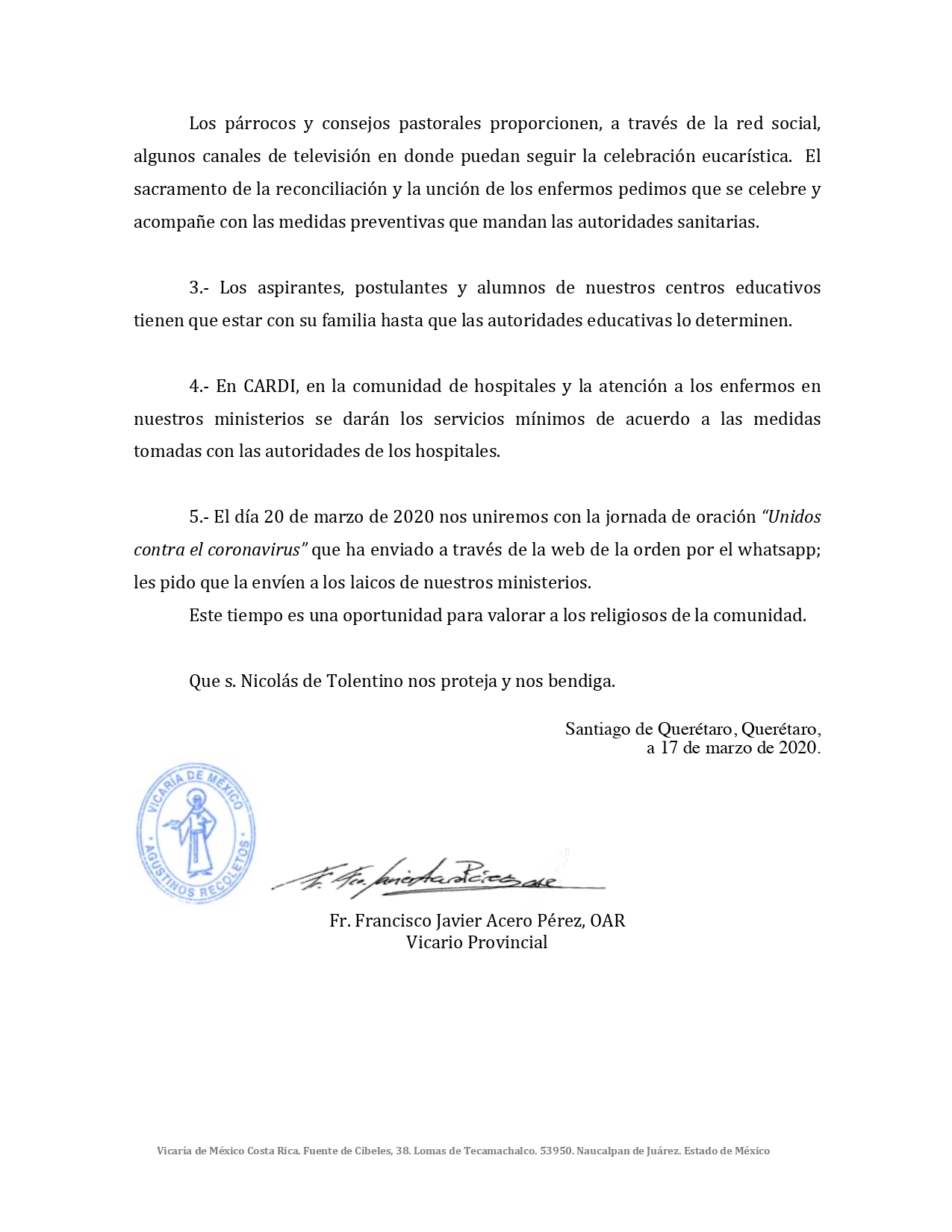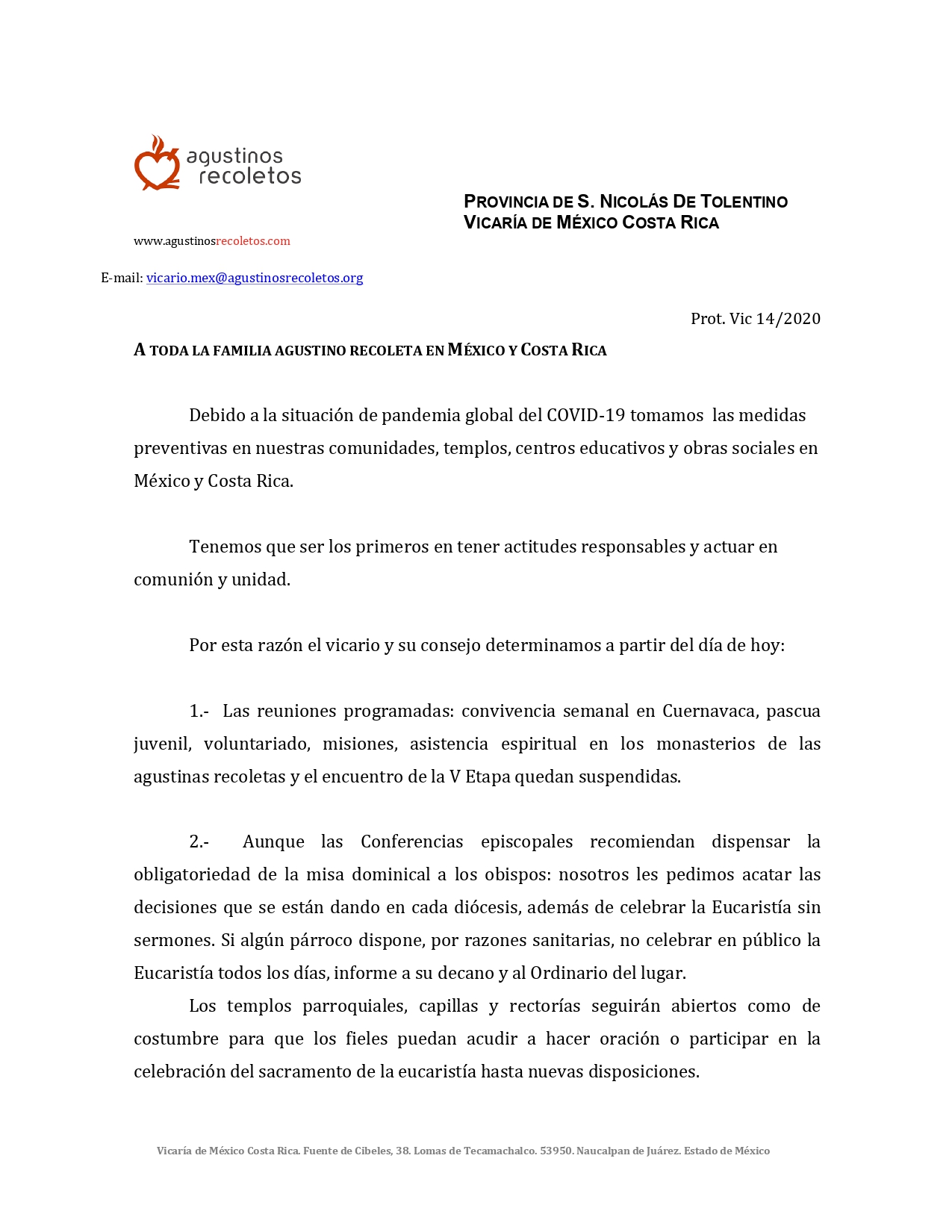 200317-Provincia de San Nicolás de Tolentino/Vicaría México Costa Rica OAR-Debido a la situación de pandemia global