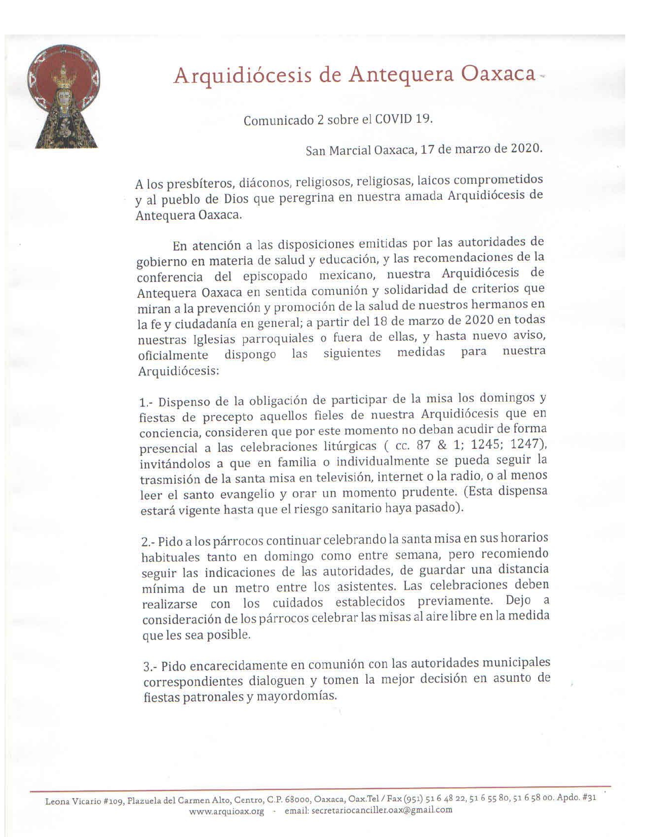 Comunicados 200317-Arquidiócesis de Antequera Oaxaca-Comunicado 2 sobre el COVID 19 Felipe Monroy 17 Marzo 2020 Share On Facebook Share On Twitter Category Comunicados Hits 1569 times Anterior Siguiente tweet