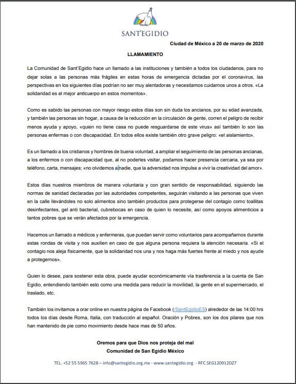 Comunicados 200320-Comunidad de Sant'Egidio-Llamamiento para no dejar a solas a las personas más frágiles Felipe Monroy 20 Marzo 2020 Share On Facebook Share On Twitter Category Comunicados Hits 1785 times Anterior Siguiente tweet