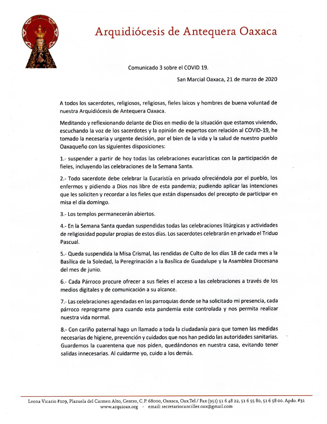 Comunicados 200321-Arquidiócesis de Antequera Oaxaca-Comunicado 3 sobre el COVID19 Felipe Monroy 22 Marzo 2020 Share On Facebook Share On Twitter Category Comunicados Hits 1813 times Anterior Siguiente tweet
