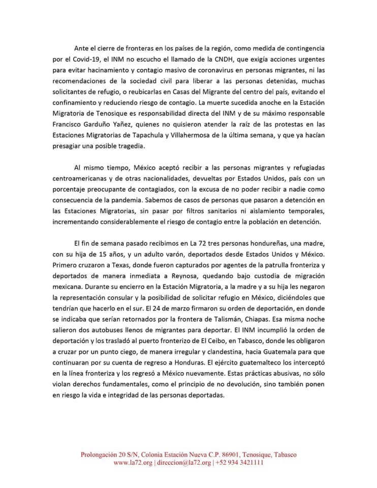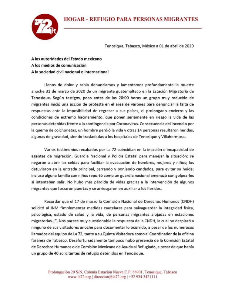 Comunicados 200401-La 72 Refugio para Personas Migrantes-Llenos de dolor y rabia denunciamos Felipe Monroy 01 Abril 2020 Share On Facebook Share On Twitter Category Comunicados Hits 2057 times Anterior Siguiente tweet