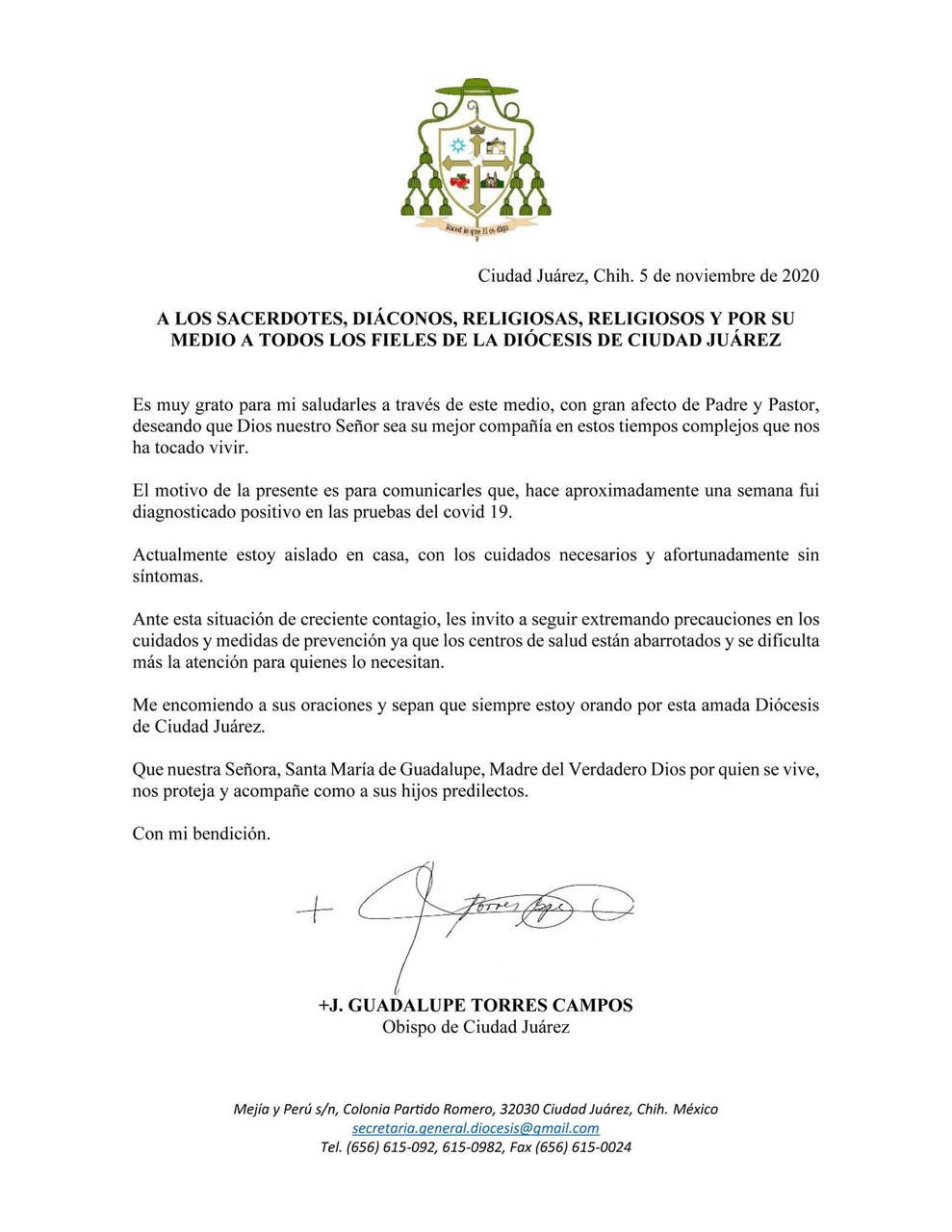 Comunicados 201105-Diócesis de Ciudad Juárez-Obispo Torres Campos diagnosticado con COVID Felipe Monroy 05 Noviembre 2020 Share On Facebook Share On Twitter Category Comunicados Hits 1586 times Anterior Siguiente tweet