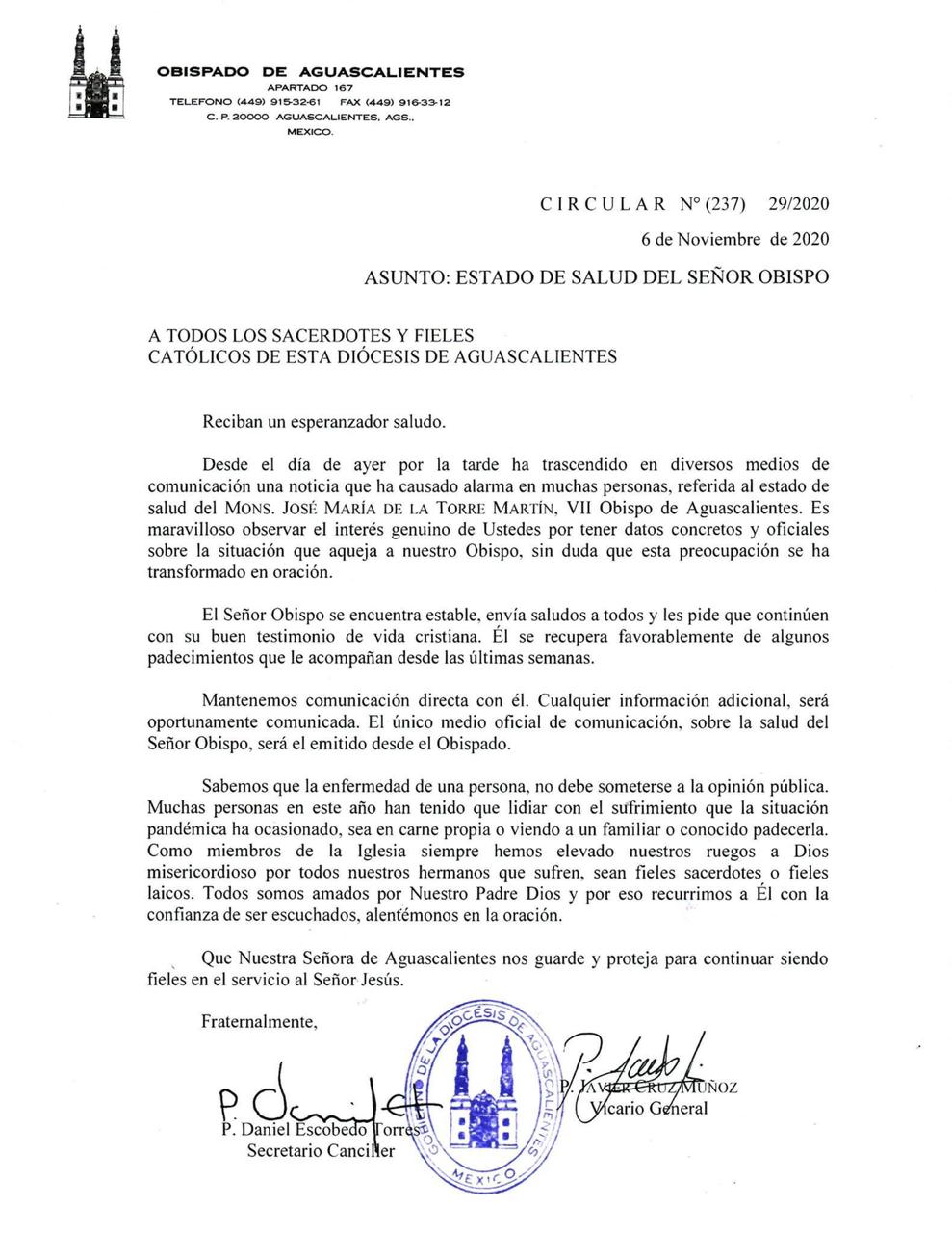 Comunicados 201106-Diócesis de Aguascalientes-Estado de salud del señor obispo Felipe Monroy 06 Noviembre 2020 Share On Facebook Share On Twitter Category Comunicados Hits 1562 times Anterior Siguiente tweet