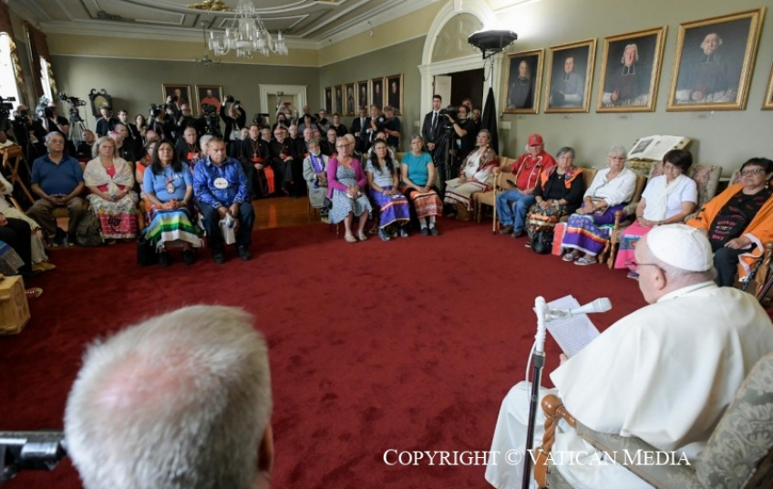 "He venido como peregrino, con mis limitadas posibilidades físicas, para dar nuevos pasos adelante con ustedes y para ustedes; para que se prosiga en la búsqueda de la verdad, para que se progrese en la promoción de caminos de sanación y reconciliación, para que se siga sembrando esperanza en las futuras generaciones de indígenas y no indígenas, que desean vivir juntos fraternalmente, en armonía", dijo a la delegación de las Primeras Naciones.