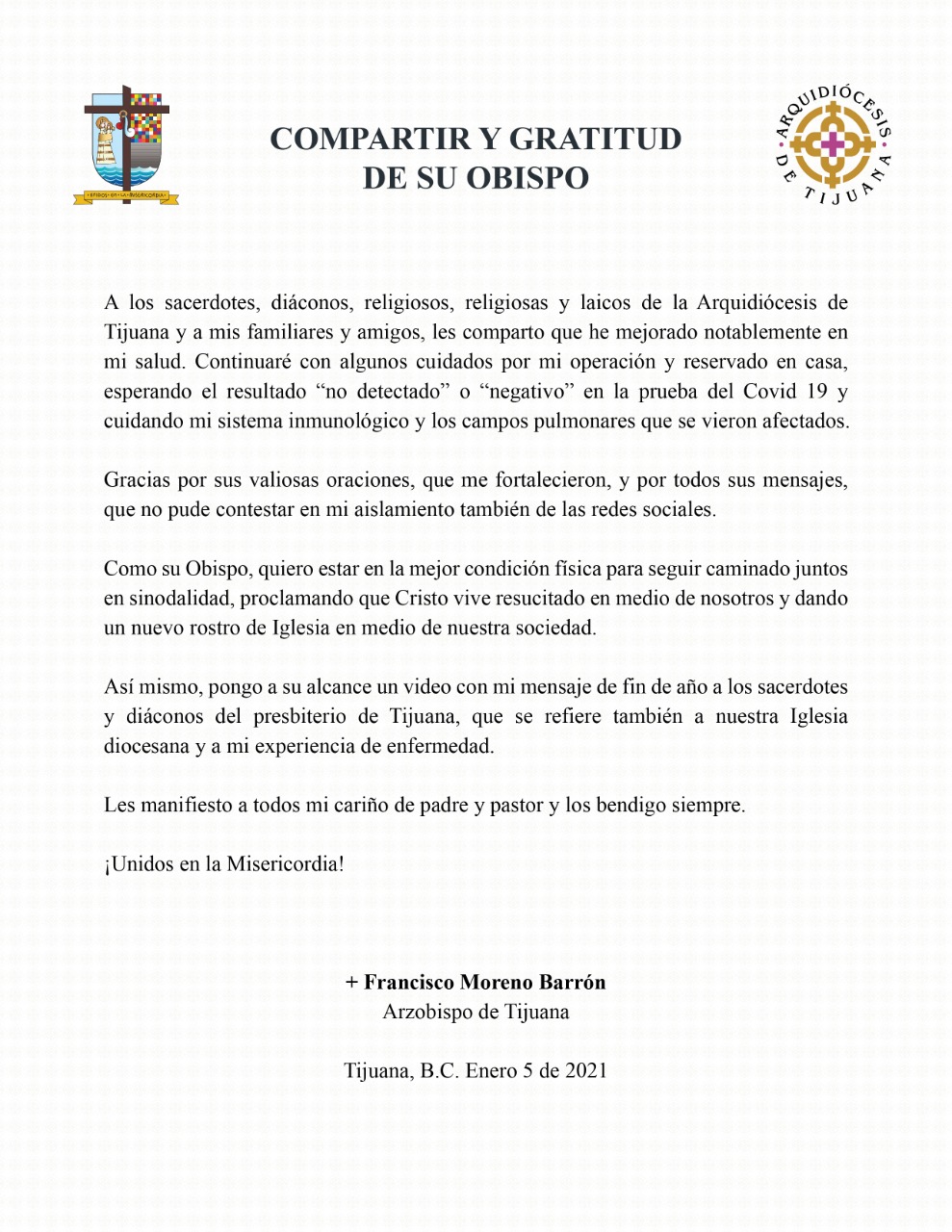 El arzobispo agradeció las oraciones y mensajes de apoyo de los fieles y ciudadanos de Baja California y pidió disculpas por no haberlos podido responder a tiempo: "No pude contestar en mi aislamiento, tampoco sus comentarios en redes sociales". Moreno nvió un video con un mensaje de fin de año para los feligreses, presbíteros y diáconos de Tijuana.