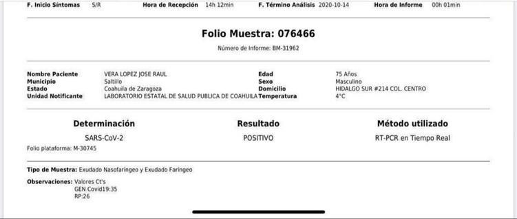 Saltillo, Coahuila.- El obispo Raúl Vera López OP, ha dado positivo como portador del coronavirus SARS-CoV2 ha informado la Oficina de Prensa de la Diócesis de Saltillo junto a la fotografía de los resultados de laboratorio del pastor de 75 años de edad.
