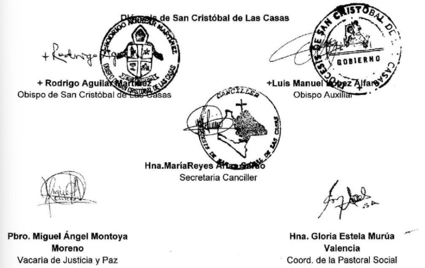 Finalmente, la Iglesia de San Cristóbal de las Casas demandó a las fuerzas de seguridad federales y estatales "a realizar el desarme y la detención de los grupos que hacen uso de armas de fuego exclusivos del Ejército Militar, tráfico de armas, detención y desaparición de personas, desplazamiento forzado, y ofrezcan garantías de vida, un retorno seguro y seguridad social, cultural y económica a la población". Firmaron la declaración el obispo de San Cristóbal, Rodrigo Aguilar Martínez, el obispo auxiliar Luis Manuel López Alfaro, la religiosa María Reyes, secretaria canciller; el sacerdote Miguel Ángel Montoya, vicario de Justicia y Paz; y la hermana Gloria Estela Murúa, coordinadora de la Pastoral Social diocesana.