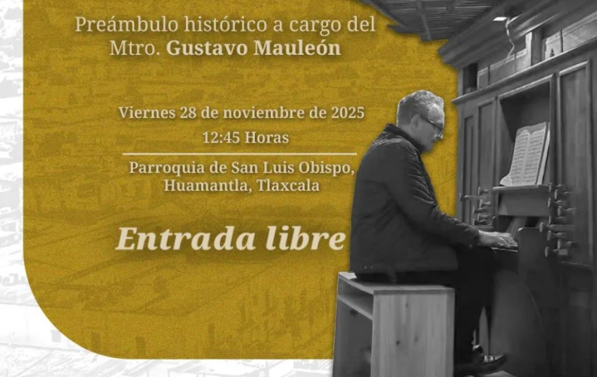Huamantla, Tlaxcala.- El Ayuntamiento de Huamantla, a través de la Crónica de la Ciudad, invita al Concierto Navideño en el Órgano Barroco de la Parroquia de San Luis Obispo. Este evento presenta una joya musical del barroco del siglo XVIII, ubicada en el coro del templo, y se realizará el viernes 28 de noviembre a las 12:45 horas.
