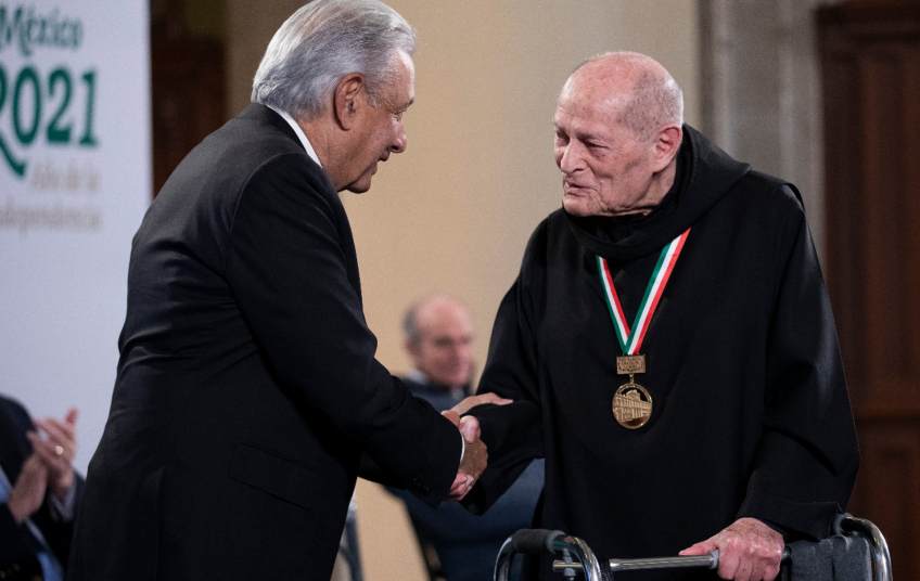 El presidente López Obrador consideró que fray Gabriel Chávez de la Mora recibió un premio "muy merecido", junto con el ingeniero Francisco Garaicochea Petrirena, ganador del Premio Nacional de Ingeniería 2020.