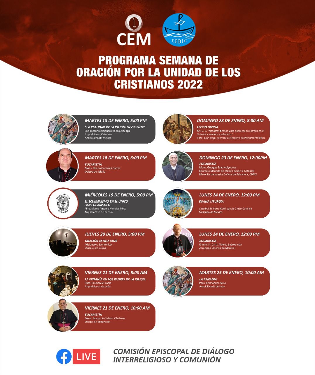 El lunes 24 de enero, la Iglesia Greco-Católica Melquita de México ofrecerá la "Divina Liturgia" desde la Catedral de Porta Coeli también en la Ciudad de México; al mismo tiempo y desde Morelia, el cardenal Alberto Suárez Inda, arzobispo emérito, presidirá la Eucaristía por la Unidad de los Cristianos.