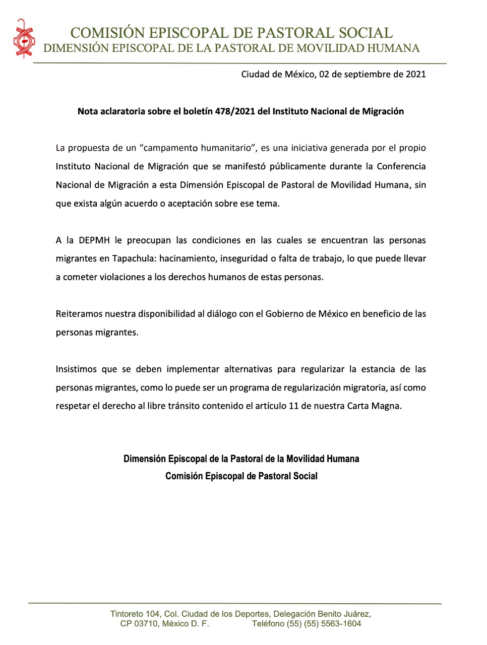 "Es una iniciativa generada por el propio Instituto Nacional de Migración que se manifestó públicamente durante la Conferencia Nacional de Migración a esta Dimensión Episcopal de Pastoral de Movilidad Humana, sin que exista algún acuerdo o aceptación sobre ese tema", aclaró la Iglesia.