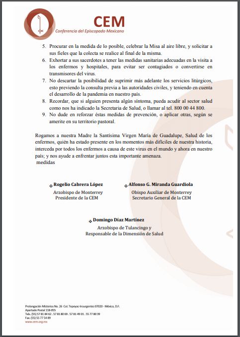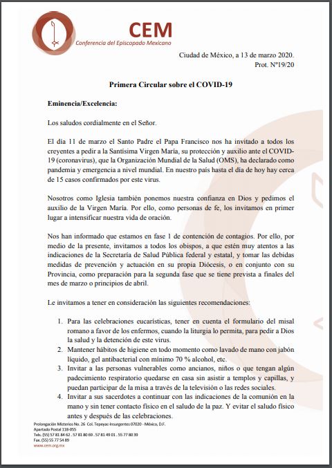 Ciudad de México.- La Conferencia del Episcopado Mexicano (CEM) envió su primera circular especial sobre el COVID-19 en el país en el que se recomienda a todos los obispos diocesanos de la República a seguir nueve indicaciones preventivas del contagio del coronavirus en sus comunidades.