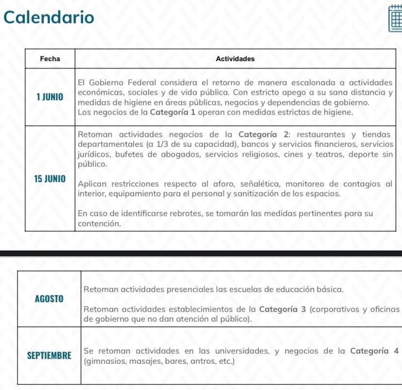 Las autoridades de la Ciudad de México adelantan que será hasta agosto que se retomen las actividades presenciales en las escuelas, los establecimientos de la Categoría 3 (corporativos y oficinas de gobierno que no den atención al público) y que en septiembre podrán reanuar actividades universidades y negocios de Categoría 4 (gimnasios, masajes, bares, etcéra).