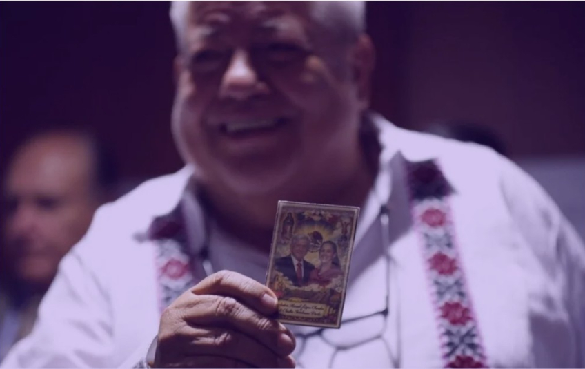 Esta estampa, que mezcla la Virgen de Guadalupe con los rostros de los líderes políticos partidistas-presidenciales –y que merece otra reflexión desde la laicidad del Estado–, no se trata de una herejía popular, sino del ministerio hecho “mysterium” en estado puro: los líderes del movimiento se presentan como si no fueran delegados contingentes de la voluntad temporal del pueblo, sino como una encarnación trascendente del pueblo mismo, ungidos por una fe civil que exige lealtad corporal y simbólica.