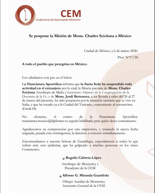 Ciudad de México.- La contención sanitaria ante el coronavirus COVID-19 declarada en Italia ha obligado a cancelar toda actividad diplomática de la Santa Sede que requiera el viaje de delegados apostólicos del Papa a otras partes del mundo; por ello, la misión especial de expertos antipederastia que la Congregación para la Doctrina de la Fe comandada por el arzobispo Charles Scicluna desempeñaría en México a finales de marzo, ha quedado suspendida por el momento.